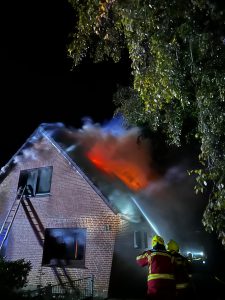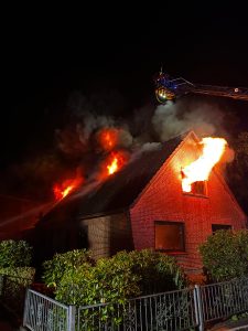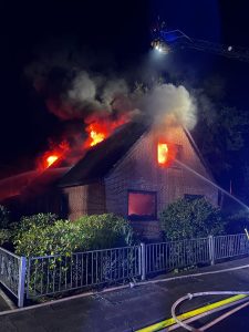 Wir wurden zu einem Brand in einem unbewohnten Wohngebäude alarmiert. Bereits bei unserer Ankunft schlugen Flammen aus dem Dach, und das Gebäude stand innerhalb kürzester Zeit in Vollbrand. Aufgrund der enormen Hitzeentwicklung war zunächst ausschließlich ein Außenangriff möglich.